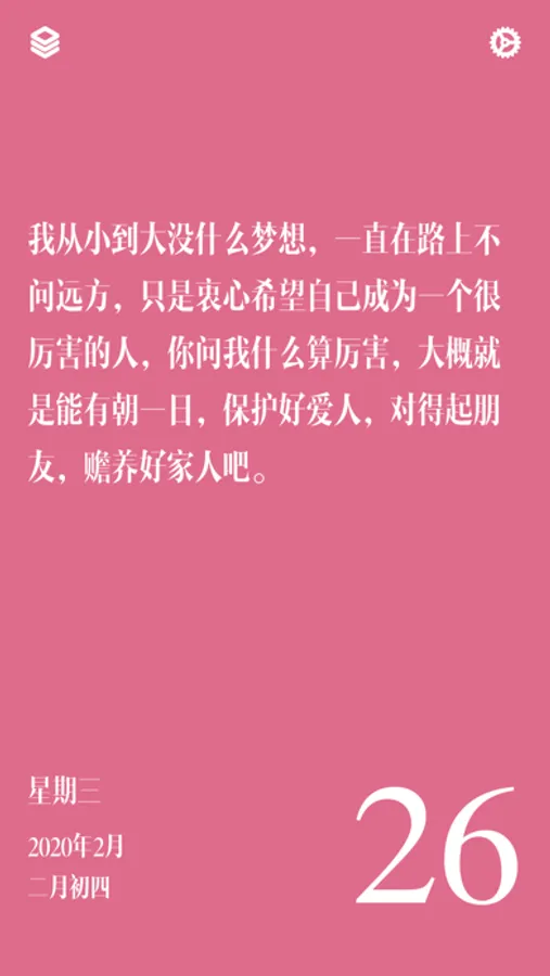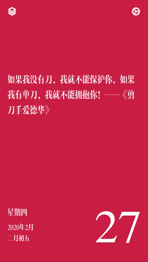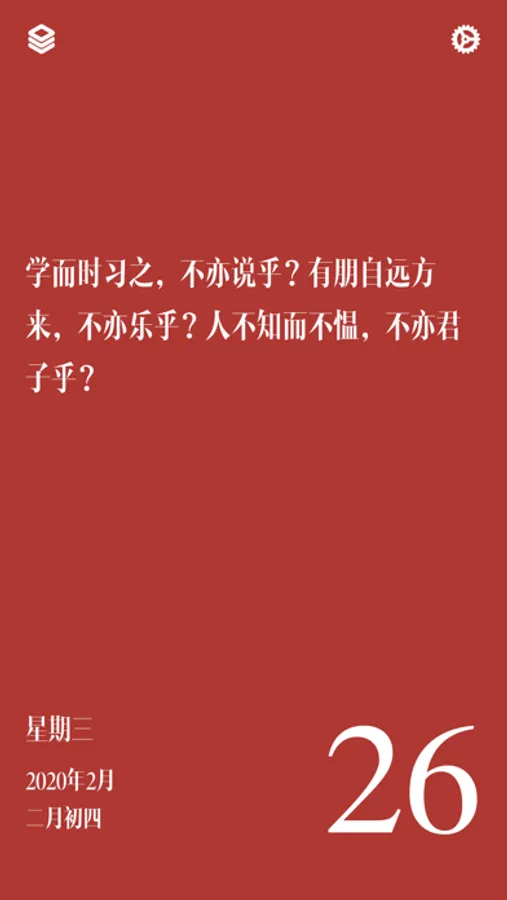 2020新语日历是一款电子日历产品。模拟真实翻开日历的场景。日历每天展示一段文字。可自由选择文字展示内容,比如儒家学派的经典著作《论语》,家喻户晓的经典电影台词,广为传唱的热门歌曲歌词等。文字的魅力,在于共情。同样一句话,不同的人讲往往会产生不一样的效果,不同的读者看了往往有不一样的感触。总有文字能引起你情感上的共鸣。支持自定义颜色。支持暗黑模式,会随着系统的暗黑模式设置而自动切换。双击支持可分享日历页面截图。