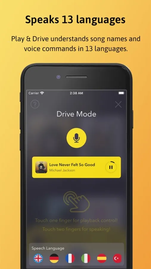 Play & Drive is a next generation music player that makes it easier than ever to control your playlist while driving. Play & Drive's ability to recognize your speech and understand voice commands lets you play a specific song, a playlist or an artist in your library just by saying its name and also control your playlist by sending specific voice commands like "play" and "recommend" without looking at the screen while driving.