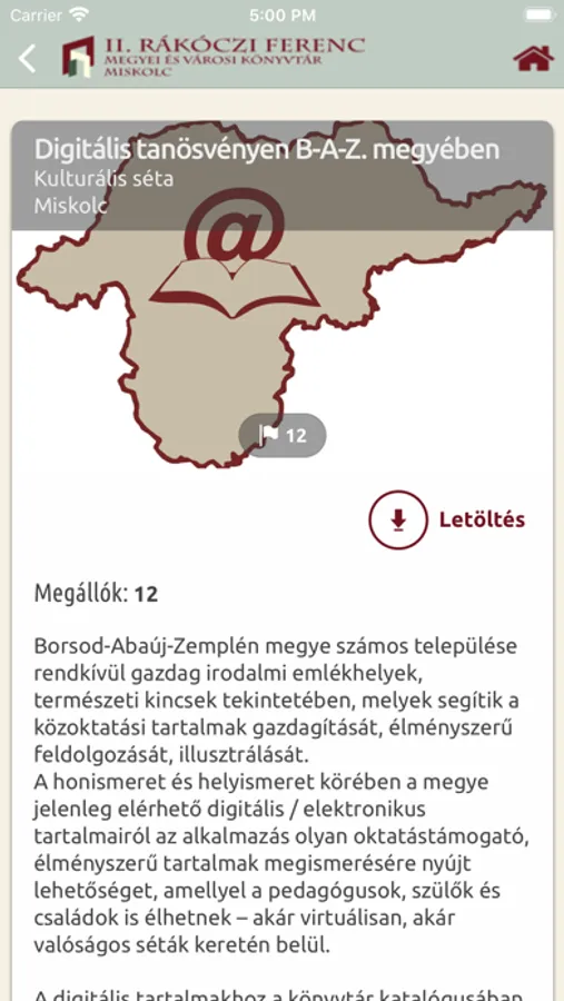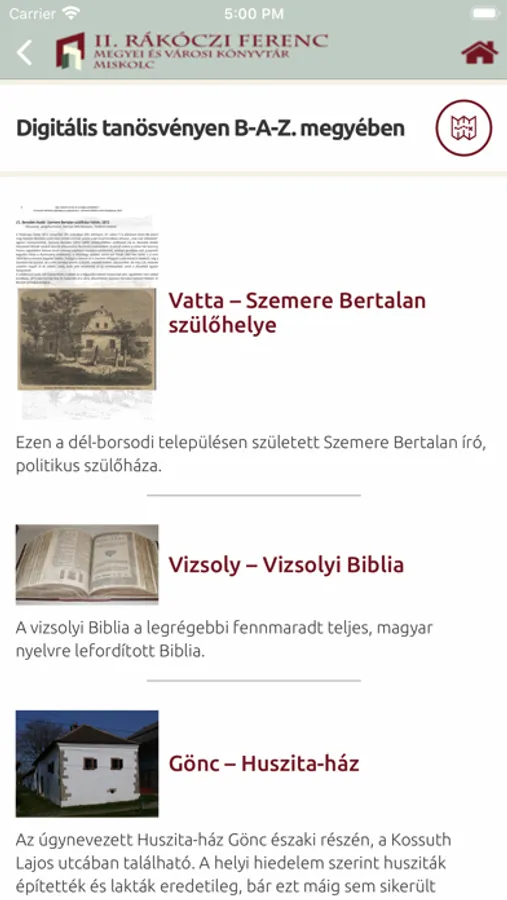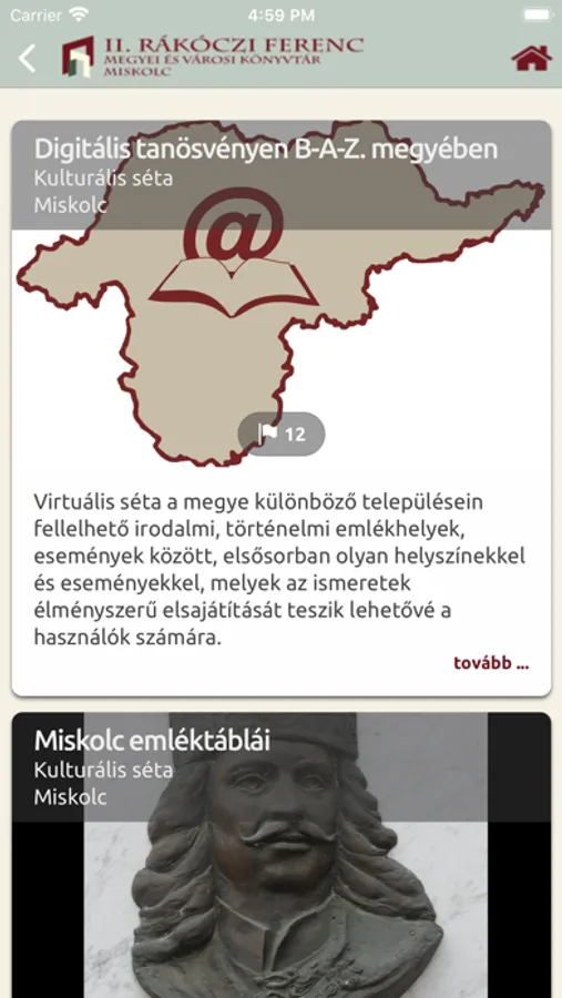 Az applikációban elérhető 3 virtuális kiállítás B.-A.-Z. megye és Miskolc kulturális örökségének feltérképezéséhez nyújt segítséget. Az applikáció bemutatja a megye irodalmi, történelmi emlékhelyeit, összegyűjti Miskolc emléktábláit, valamint Miskolc múltjának és jelenének megismerését régi képeslapok felhasználásával teszi színesebbé.