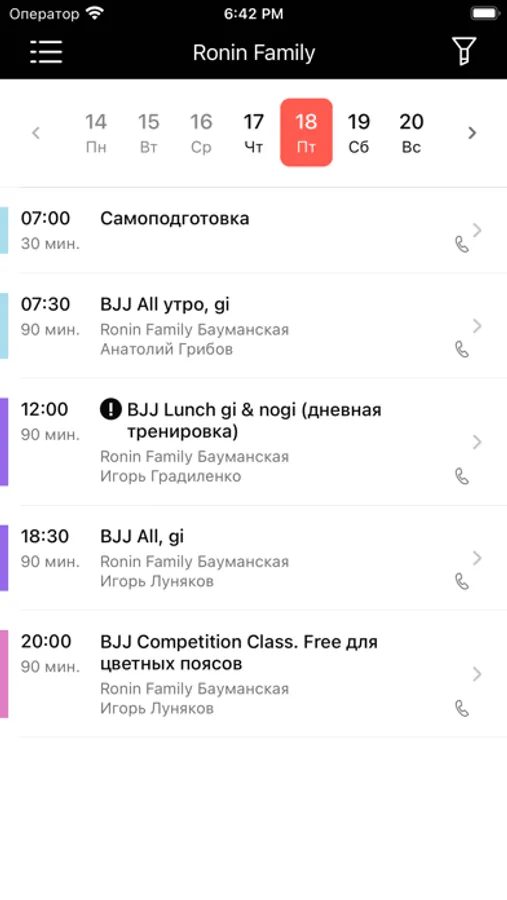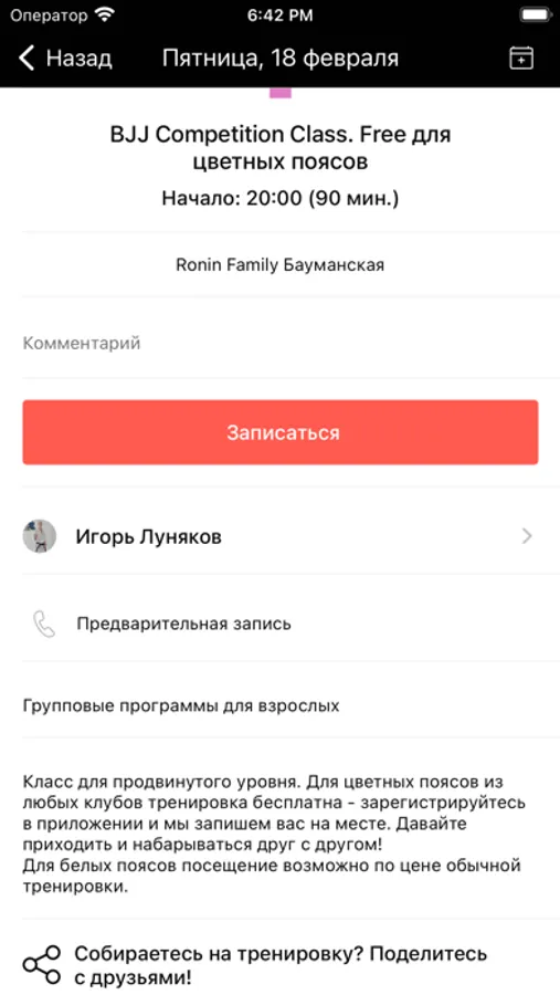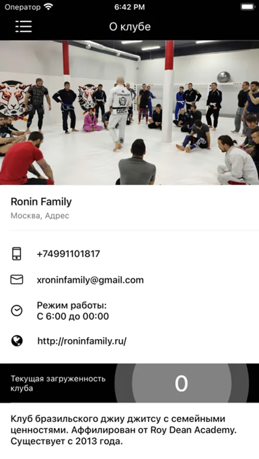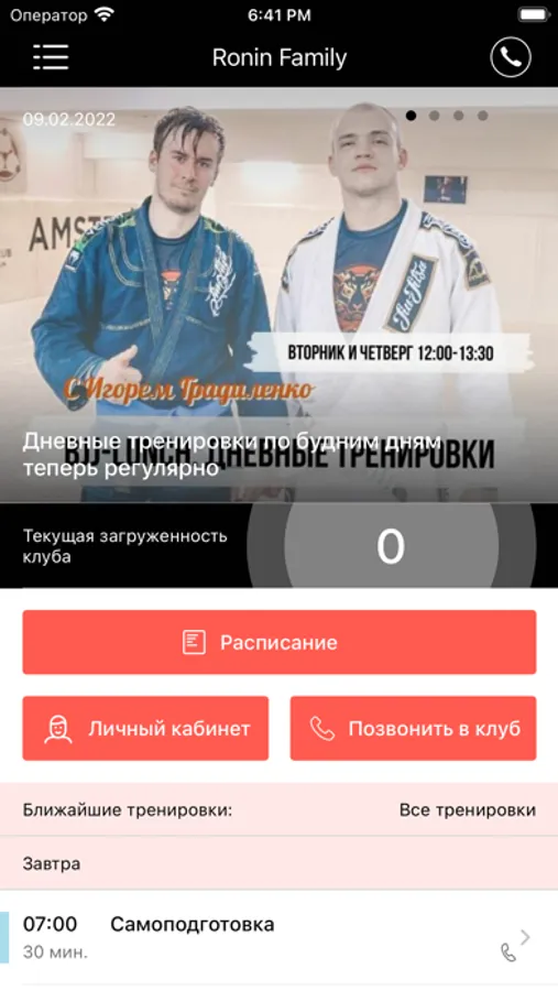 Приложение для записи на тренировки и события в клубе Ronin Family и на занятия в его клубах-партнерах.