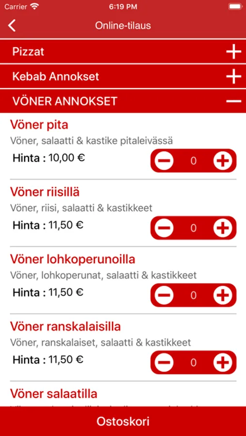 Tilaa pizzat ja kebabit noutona tai kotiinkuljetettuna. Tarjontaamme kuuluvat Pizzat, Vegaanipizzat, Kebab Annokset, RULLAKEBABIT, VÖNER ANNOKSET, Kana - annokset, Finger food, WINGS, Kasvisruoat, Kasvisruoat, Lasten annokset, Juomat ja salaatit.