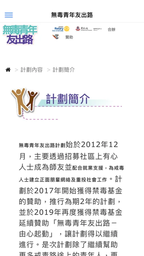 「無毒青年友出路」計劃由金鐘扶輪社和東華三院越峰成長中心攜手合辦,獲得保安局禁毒處禁毒基金贊助。計劃的創辦宗旨是幫助曾經吸毒的青年人重返正常生活軌道,重拾自信和人生方向。同時,提升和增強公眾對香港青年人吸毒問題的關注。計劃並提供全方位的支援服務,包括向有需要的青年人及其家人提供輔導服務、師友同行關懷計劃、康復支援,自我成長,以及職業輔導服務。