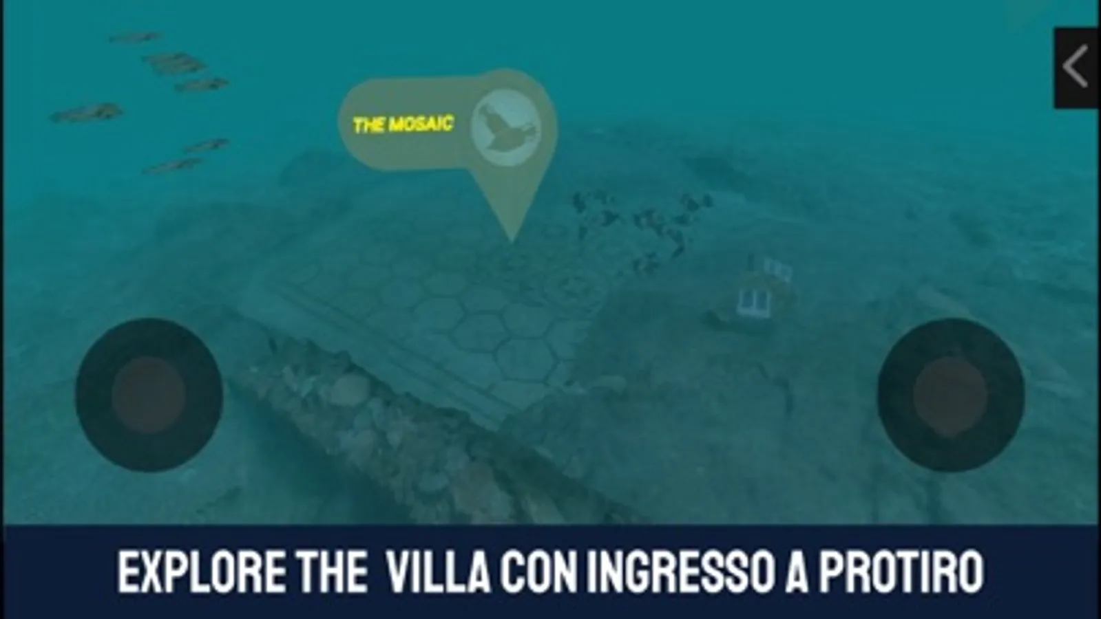 Thanks to the iMARECULTURE project, you can explore the ruins of Villa con ingresso a Protiro, composed of a series of rooms with a central atrium to provide them with light. Within these rooms there are some wonderful mosaics. During the virtual exploration you will be able to listen some information about the structures, and activate the hypothetical reconstruction and see how the villa appeared in Roman times.