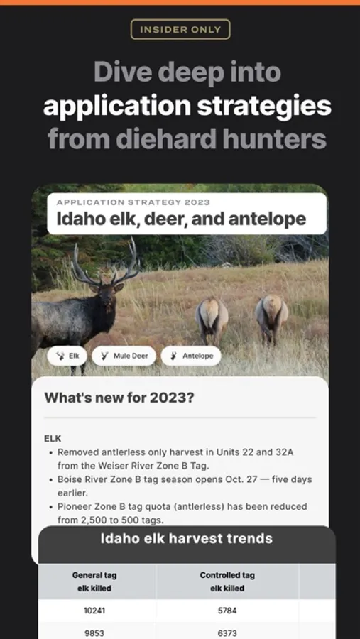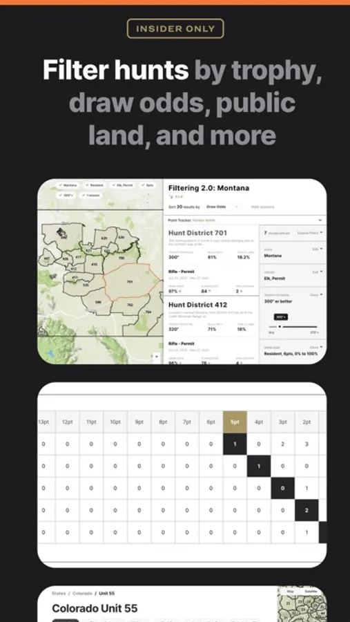 GOHUNT’s Insider research platform gives you even more tools to find tags or permits, research strategies, and in-depth hunt unit profiles. With the most advanced draw odds in the industry, innovative filtering and tag finding tools, strategies and research articles from diehard hunters - you’ll wonder how you ever planned a hunt without it.