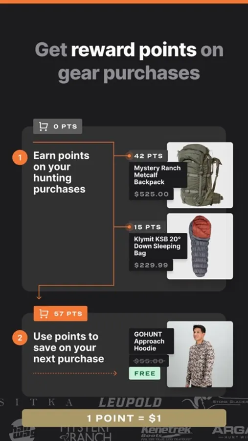GOHUNT members also get the best gear for less through our gear rewards program. Earn points on every eligible purchase in our gear shop and redeem those points for hunting gear from brands like Sitka, Vortex, Mystery Ranch, Hanwag, Stone Glacier, and more. Each point is worth $1 on a future purchase. With a curated selection chosen by diehards, you can trust the gear you buy, and even contact our team with questions about what’s best for your upcoming hunt.