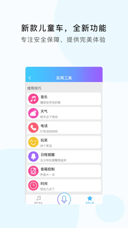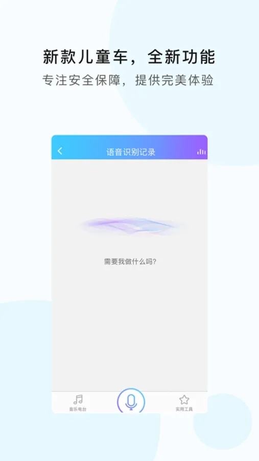 APP集成了AI智能功能,可以在车上跟机器对话,实现播放音乐,打电话,讲故事,查询天气,讲笑话等。满足儿童对这个世界的好奇心,是小孩贴心的老师,又是一个很好的玩伴。