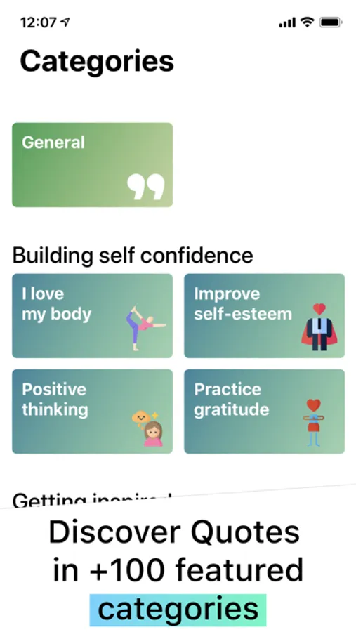 The app includes all kind of topics from quotes about “A new day” till Z like “Zumba”. More than 100 featured categories like self-esteem, relationships and dealing with stress, as well as a selection of carefully designed themes to choose from - updated frequently.
