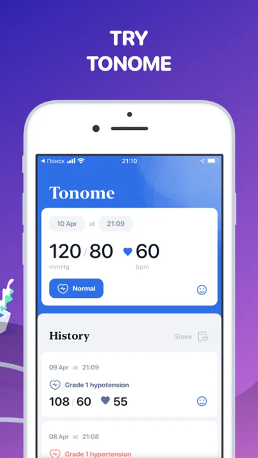 Tonome can be used to create records of your blood pressure measurements. Tonome cannot measure blood pressure.