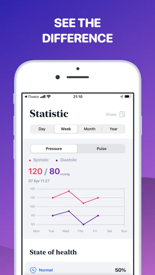 Track the dynamics of changes in heart rate and blood pressure in the graph in order to notice improvement or deterioration in the measurements.