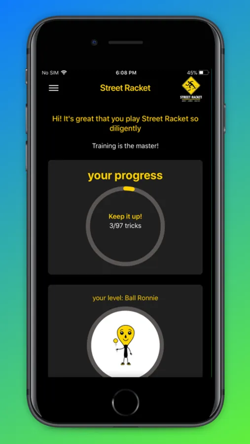 With this app you will get to know the many advantages of Street Racket in a playful and active way. There are numerous exercises in the four mandatory categories so that you can familiarize yourself with the ball, the racket, the playing field and the basic game of Street Racket. The exercises in these four categories are compulsory. That means you can only play the next exercise if you have completed the exercise before. When you have completed the four mandatory categories, you will be unlocked and you can choose between the different game options (indoor, friends etc.). With each category you have completed you earn the next higher avatar. With each exercise you play, you earn a certain number of points that are credited to your account. You can redeem the points at the appropriate time for corresponding actions. You can therefore play an exercise several times and collect points if you do not want to advance to the next level. Practice makes perfect!