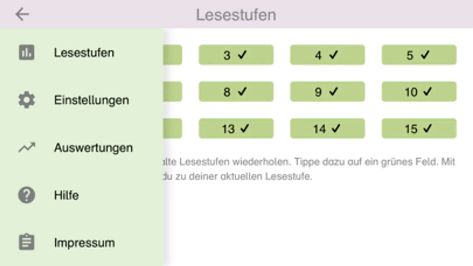 - Die App ist in 15 Lesestufen gegliedert.