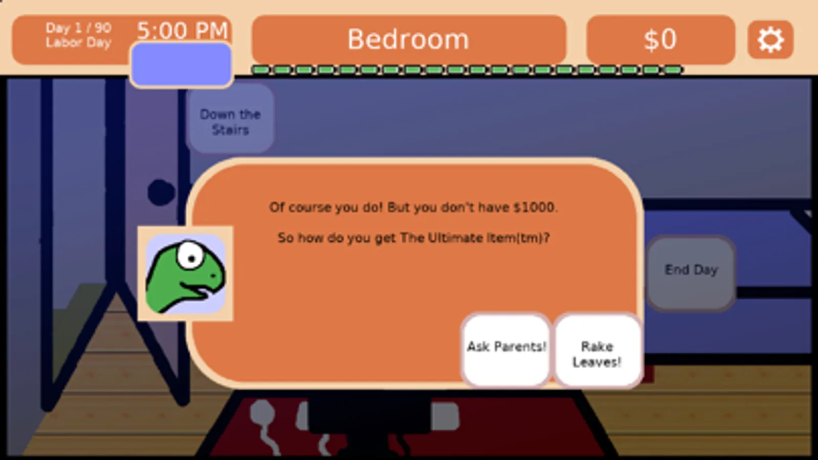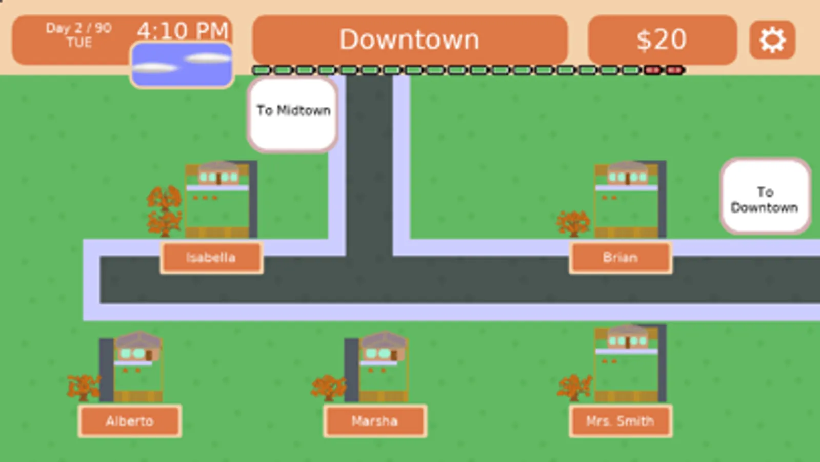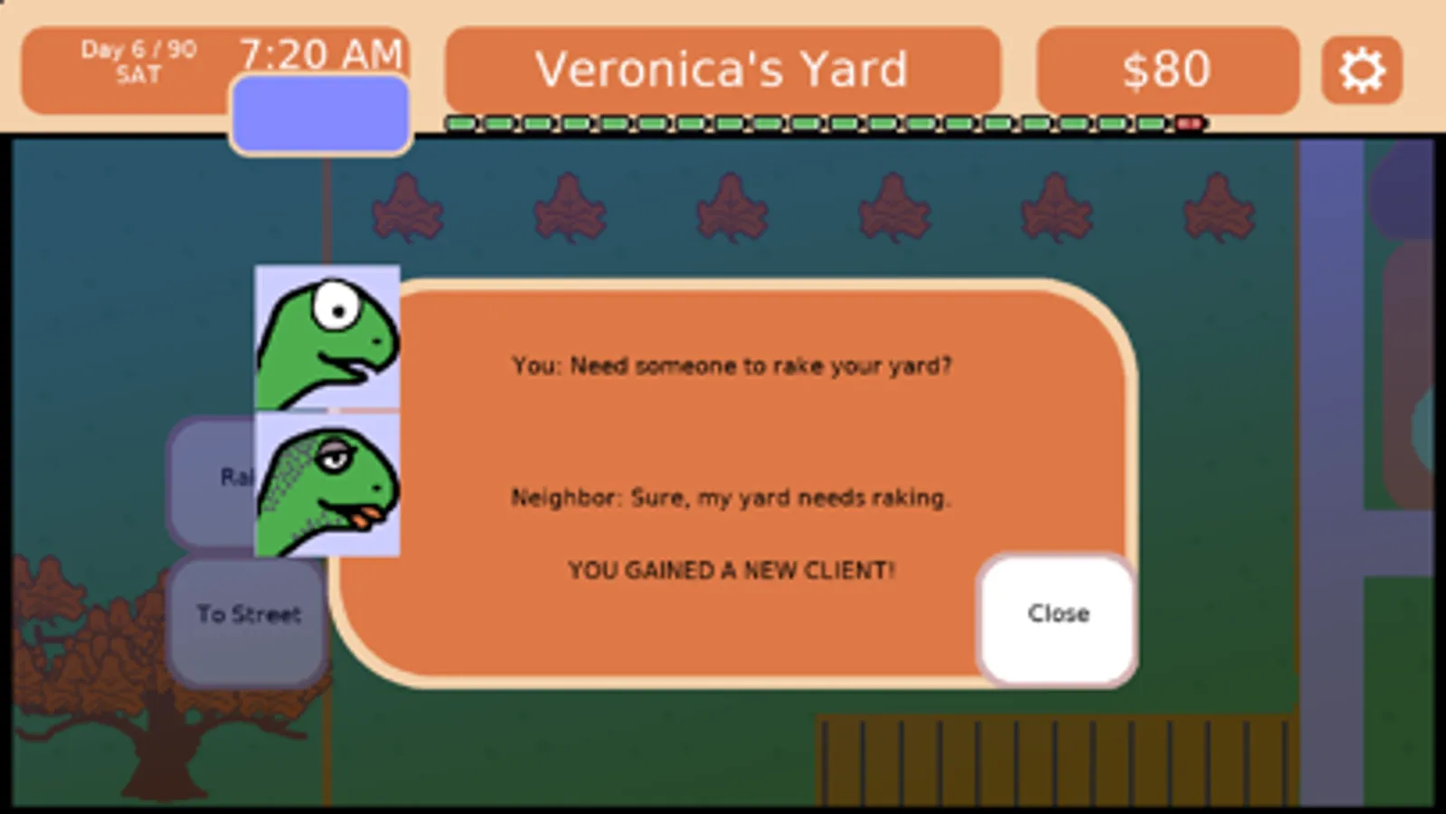 You'll need to make sure you get enough sleep to recover your energy, but you'll also want to finish raking yards early and often to get the most income. Do you go to bed early so that you're ready to take on the next day, or stay up late to get those last few leaves knowing you'll be a little tired in the morning? You decide.