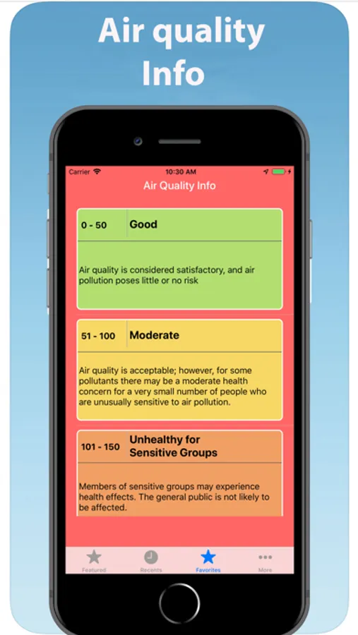 - Green: AQI 0 - 50 Good Air quality is considered satisfactory, and air pollution poses little or no risk