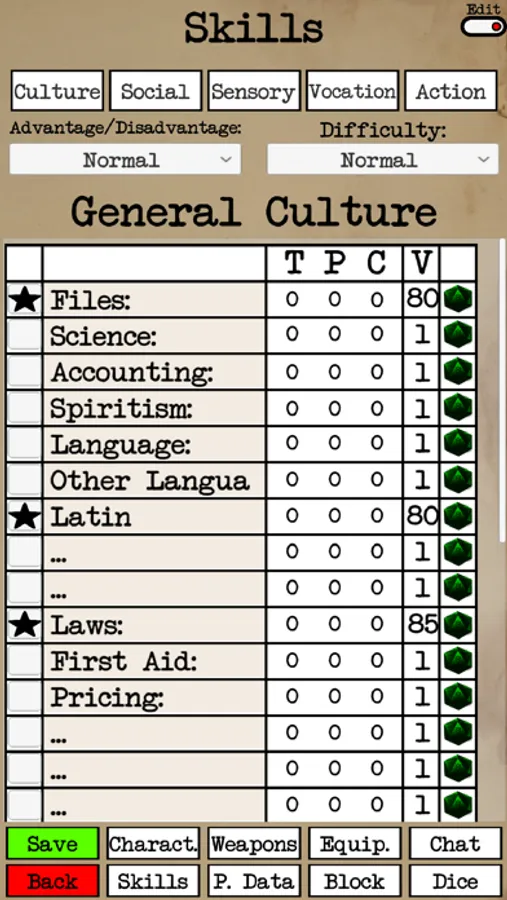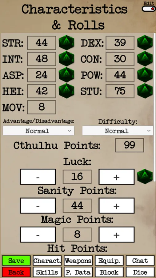 This application is a Character Sheet for Cthulhu RPG. You can create your character in a simple way and play with your friends.