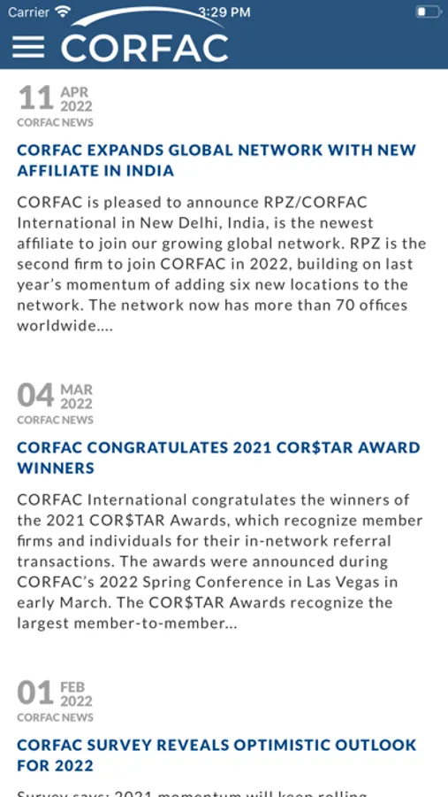 Established in 1989, CORFAC International is a network of independently owned commercial real estate brokerage firms. CORFAC currently has offices in 50 U.S. markets, 5 Canadian markets and 22 international markets, including Australia, Colombia, France, Germany, Ireland, Italy, Japan, Malaysia, Mexico, the Netherlands, Romania, Russia, Singapore, South Korea, Switzerland, Thailand, United Arab Emirates and the United Kingdom.