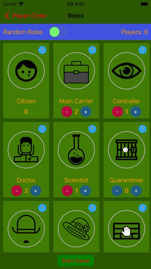 The main carrier tries to infect and kill everybody else and stay alive. The controller looks at someone with a thermal camera and checks that person infected or not. The doctor heals the infected people before they die. The scientist has a special vaccine but it's not tested, so it can kill.