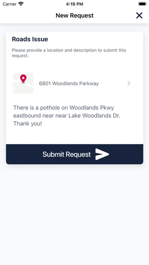 - Pinpoint the request location using your current location, an address, or by locating the best placement on a map