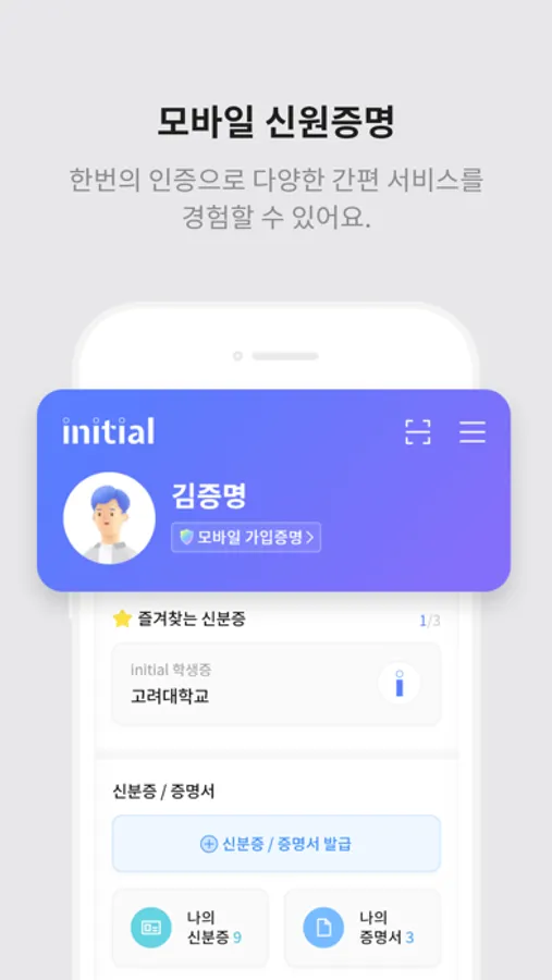 initial 앱을 통해 다양한 신분증과 증명서를 발급부터 제출까지 간편하게 이용할 수 있어요.