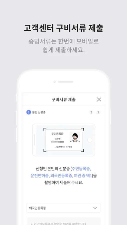 고객센터 업무에 필요한 신분증, 주민등록표등본, 기타 서류를 initial로 촬영하여 한번에 제출하세요!