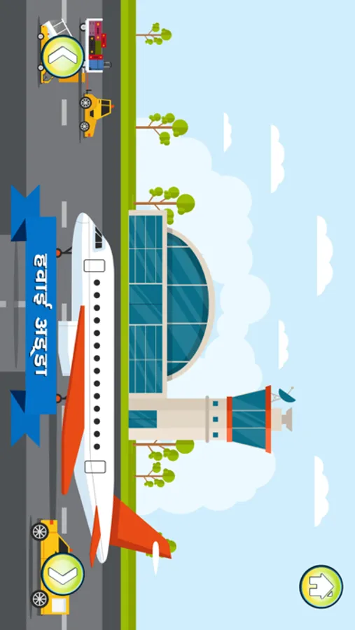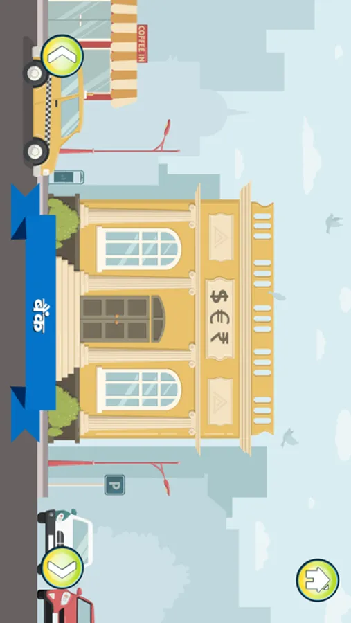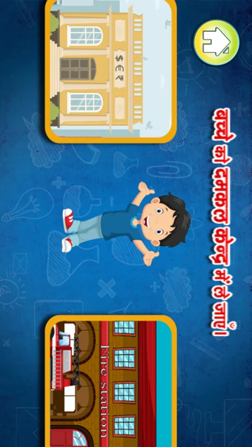 चरण 1 (सीखना): यह जगह के नाम के साथ जगह की छवि और इसके सही उच्चारण के साथ एक आवाज प्रदर्शित करता है। इसके स्थान इस प्रकार हैं: बैंक, एटीएम, चर्च, फायर स्टेशन, अस्पताल, बस स्टॉप, कैफे, आदि।
