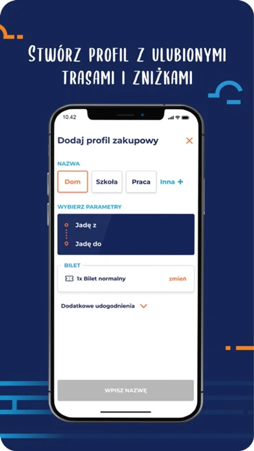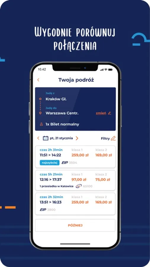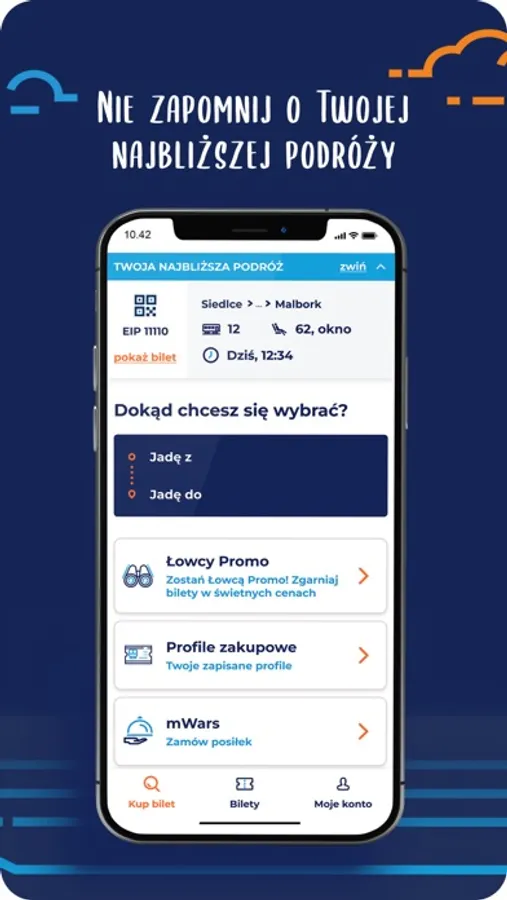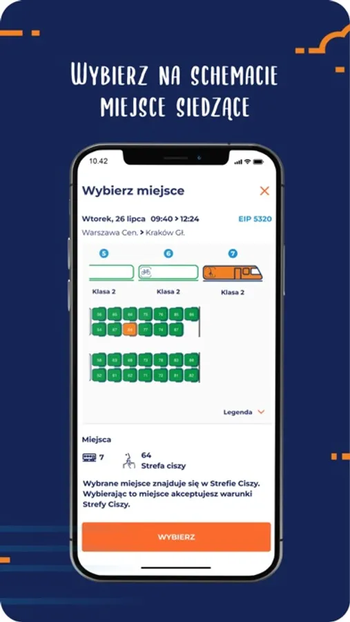 Aplikacja PKP INTERCITY umożliwia zakup biletów na pociągi wszystkich kategorii: EIP, EIC, IC i TLK przy zastosowaniu ulg ustawowych i aktualnych promocji. Wygodny zakup biletów powrotnych, możliwość tworzenia profili zakupowych uwzględniających najczęstsze trasy i posiadane ulgi. Umożliwia zakup biletów dodatkowych jak przewóz roweru, psa lub dodatkowego bagażu i wybór miejsca ze schematu. Dodatkowo pozwala zamówić posiłek z WARS z dostawą do miejsca. Dostęp do zakupionych biletów również w trybie offline.