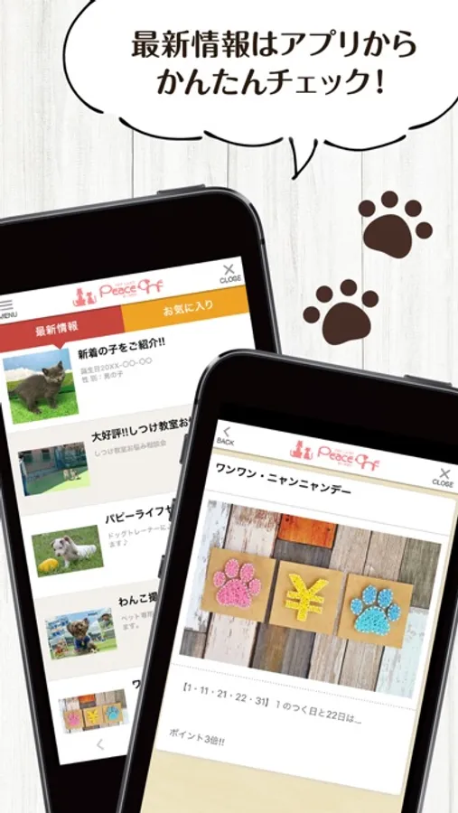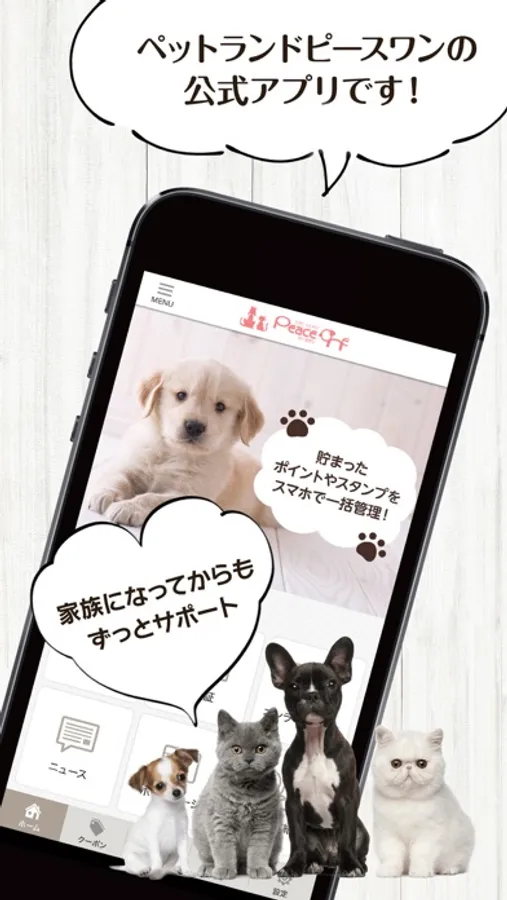 ピースワンのワンちゃんネコちゃんの情報、SALE情報が届くほか、アプリ限定のクーポンやスタンプ、WEBストアと共有で使えるポイントを貯めて、