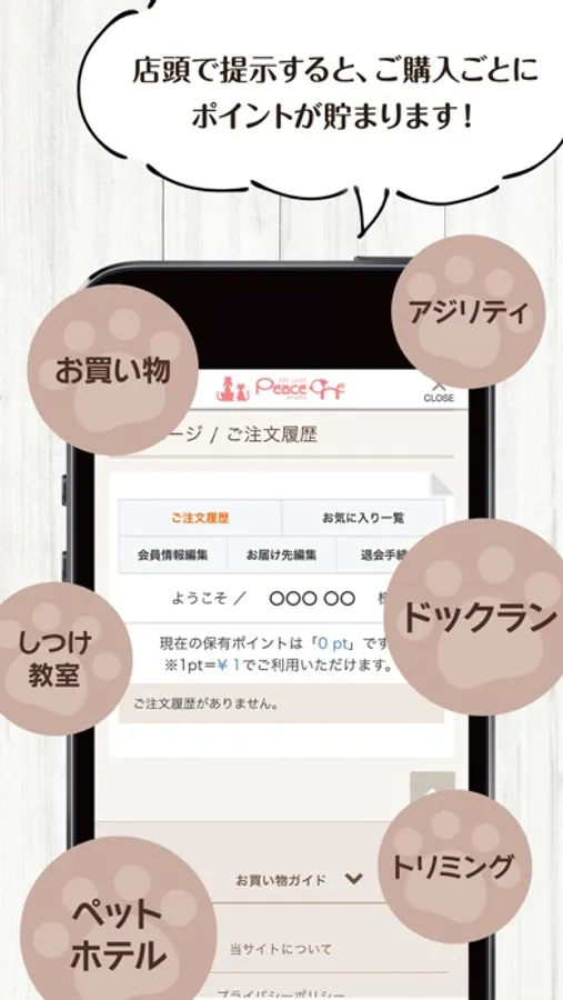 ワンちゃん・ネコちゃんのご購入やフードやペットのお洋服などのお買い物、トリミングなどのピースワンご利用で貯まります。