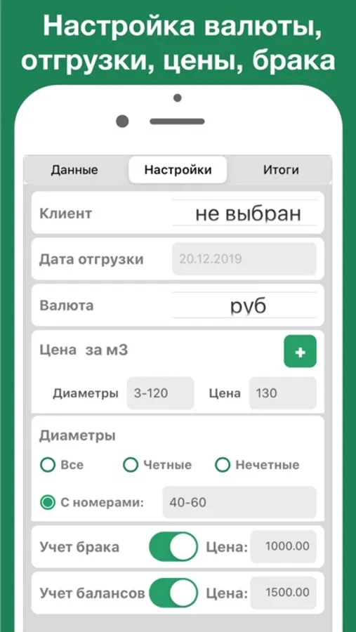 ► подсчет суммарного объема, количества и цены для каждой группы диаметров