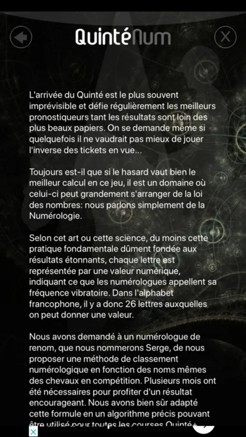 Nous avons demandé à un numérologue de renom, que nous nommerons Serge, de nous proposer une méthode de classement numérologique en fonction des noms mêmes des chevaux en compétition. Plusieurs mois ont été nécessaires pour profiter d'un résultat encourageant. Nous avons bien sûr adapté cette formule en un algorithme précis pouvant être utilisé pour toutes les courses Quinté+.