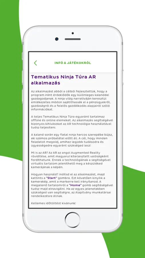 Kattints az ”Ízelítő AR” gombra, itt rögtön megnézhetsz 4 virtuális karaktert a játékokból. Egy további menüpontban az Alapítvány munkásságáról tájékozódhatsz és az elérhetőségeket is megtalálod.