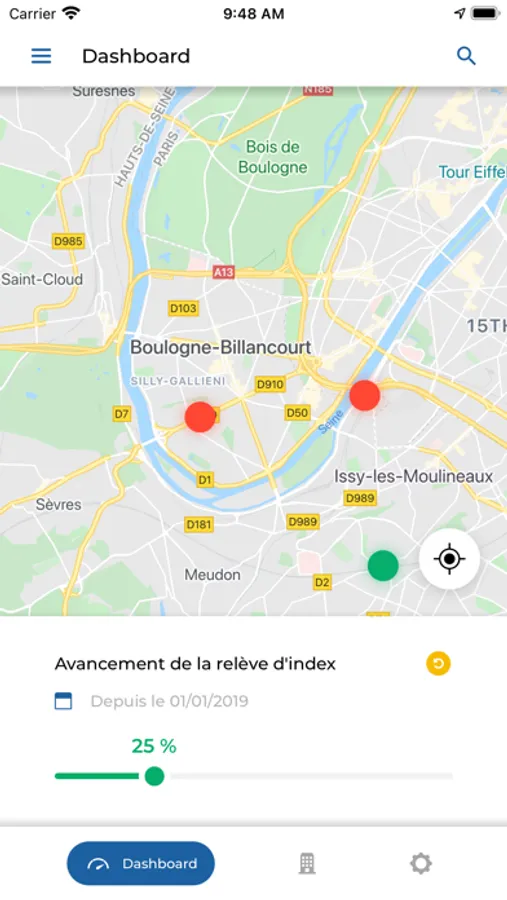• Visualisez l'avancement de la relève des compteurs sur votre périmètre et identifiez les sites les plus proches de vous restant à relever