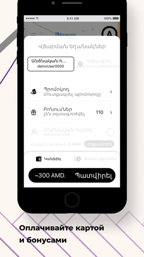 Оплачивайте поездки наличными, картой или накопленными бонусами.