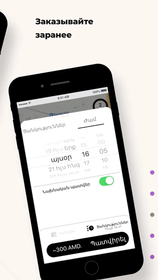 Выберите опцию “Предварительный заказ”. Поиск автомобиля начнется незадолго до заказа поездки, и автомобиль приедет к назначенному времени. Также вы будете заранее знать стоимость поездки.
