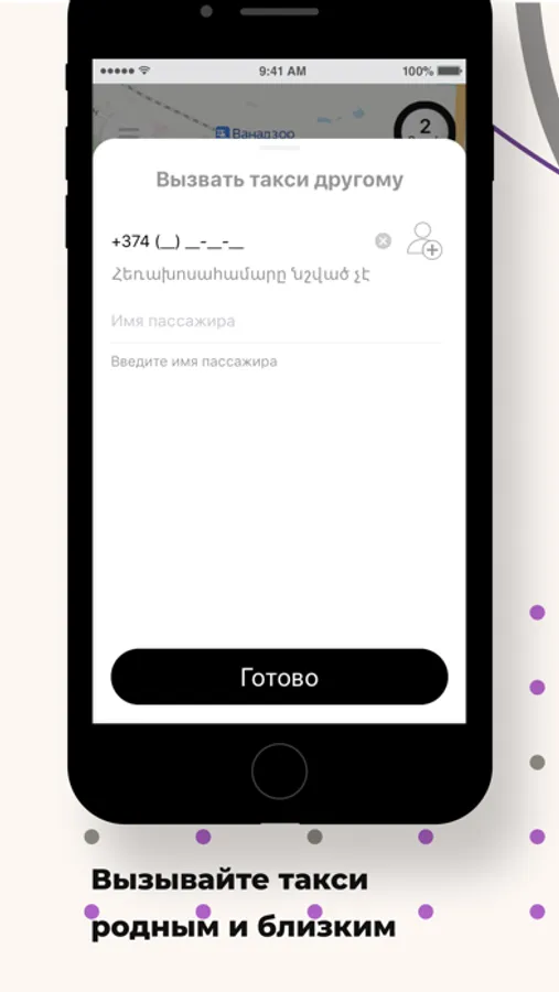 Используйте опцию “Вызвать такси другому” в разделе “Пожелания” и укажите его номер телефона. Когда такси подъедет, на указанный номер придет СМС, а вам — сообщение в приложении.