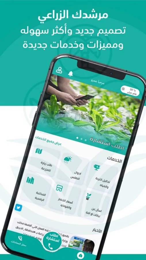 تم انشاء تطبيق مرشدك الزراعي الذي يقدم الخدمات الارشادية في مختلف المجالات الزراعية التي من شأنها نقل مستوى الخدمات الزراعية في المملكة العربية السعودية الى اعلى مستوياتها.