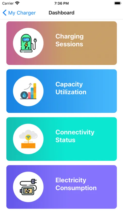 • Dashboards - View all the charging sessions filtered by month. Reports like Capacity Utilization, Connectivity Status, Electricity Consumption are available for the user.