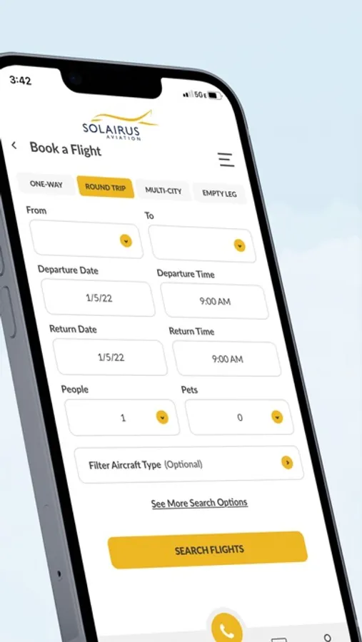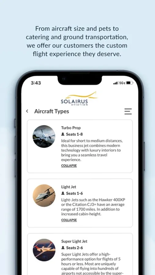 The Solairus App allows you to charter private jets while offering a personalized travel solution that is tailored to your specific requirements and aircraft needs, available where you are, and when you need it.