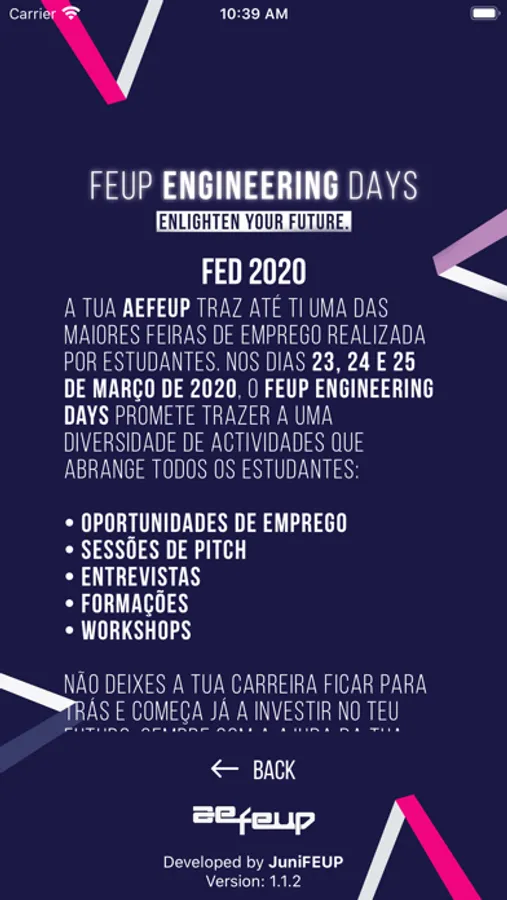 Nesta aplicação vais poder encontrar todas as informações deste evento, enviar o teu CV para empresas e participar no nosso jogo habilitando-te a ganhar prémios!