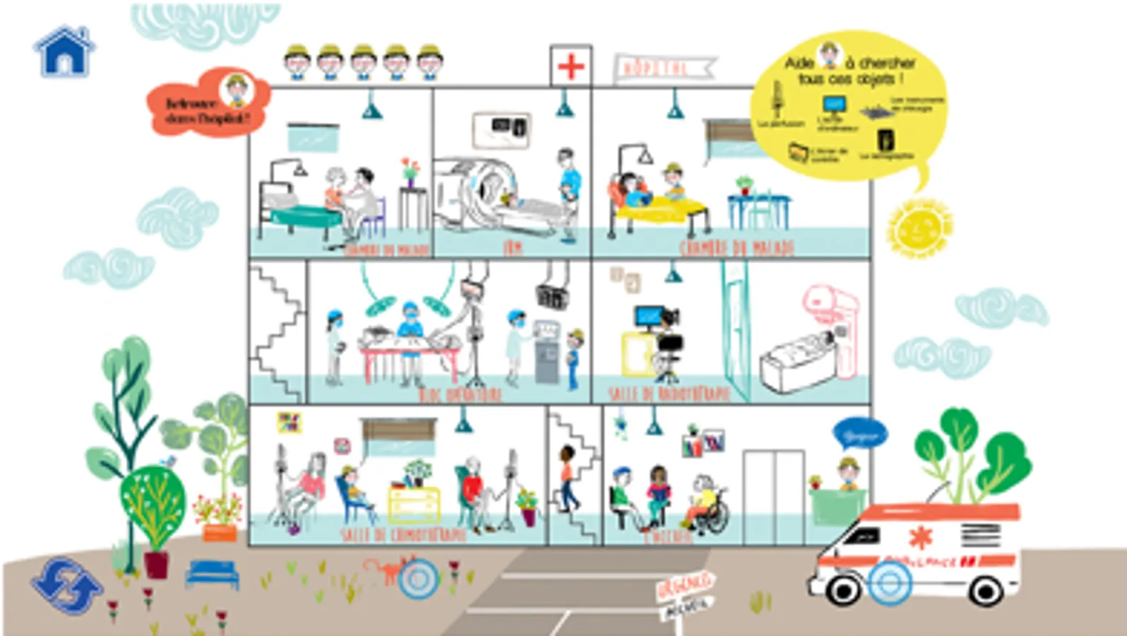 2. La rubrique « L'hôpital » : elle fait découvrir le parcours de soins du parent et les changements possibles, à travers deux mini-jeux et selon une progression dans les différentes pièces de l'hôpital.