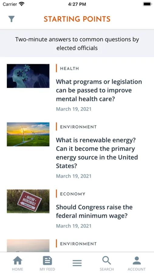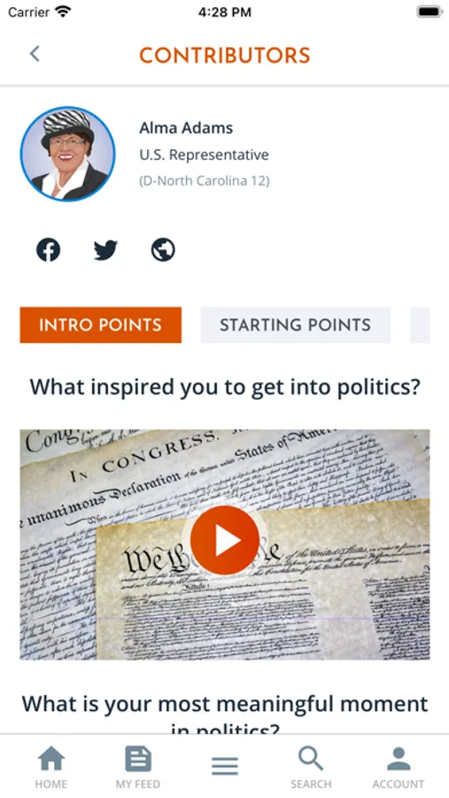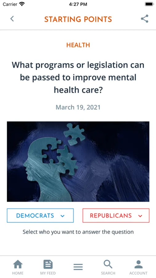 A Starting Point is a civic engagement app that creates a clear and bipartisan channel of communication and connectivity between Americans and their elected leaders. The video-based platform helps voters better understand the issues of the day in less than two minutes. Our goal is to create a more informed electorate.