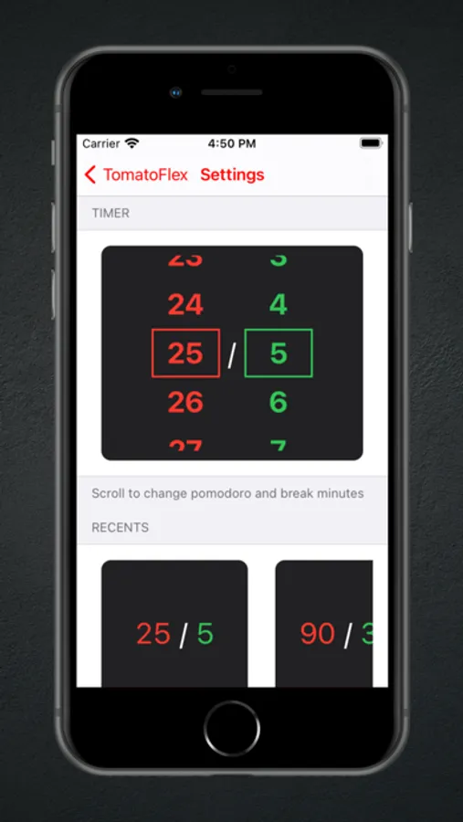 - Work/break settings from 1 minute to 90 minutes
