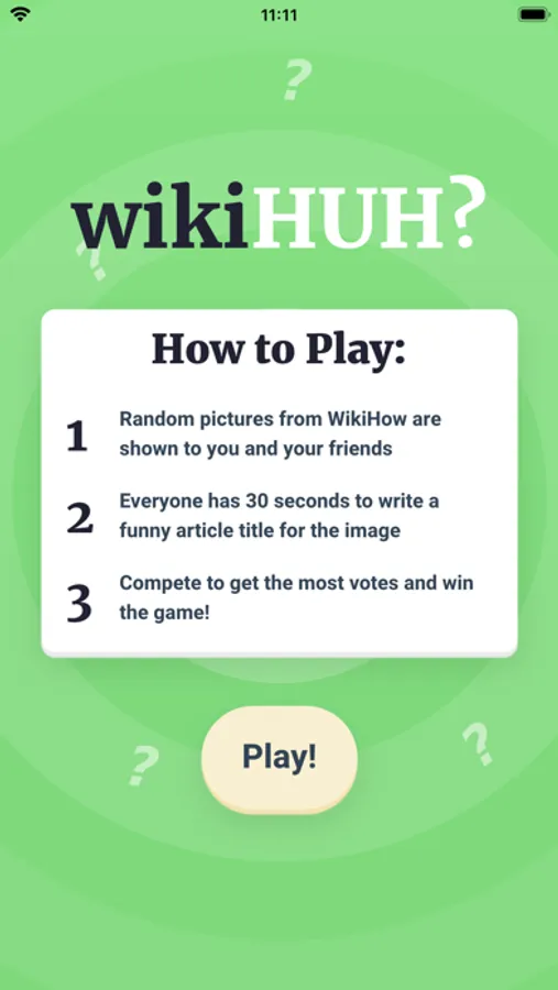 In WikiHuh, you and your friends compete in a social, creative, party game to write funny titles for wikiHow images. Each round, a random picture from wikiHow will be shown to all players, and everyone has 30 seconds to write an article title to go with the image. Then, they compete to get the most votes and win the game!