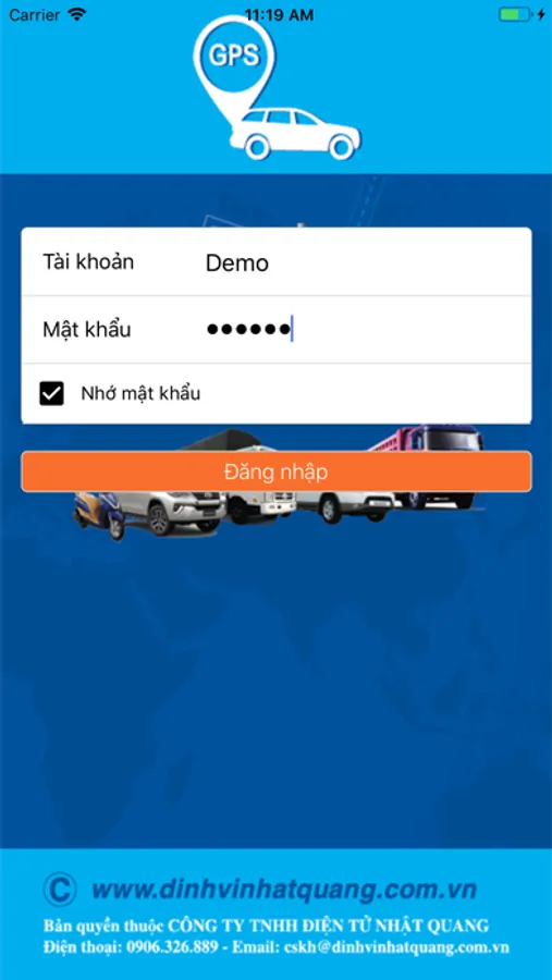GPS Nhat Quang là app dùng định vị và quản lý phương tiện vận tải ( xe tải, xe khách, xe cá nhân,...). Ứng dụng có thể giám sát thời gian thực, xem lại lộ trình di chuyển, báo cáo ra vào kho, báo cáo qua trạm thu phí, quản lý nhiên liệu tiêu hao, và nhiều module quản lý hữu ích cho doanh nghiệp vận tải