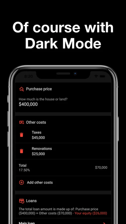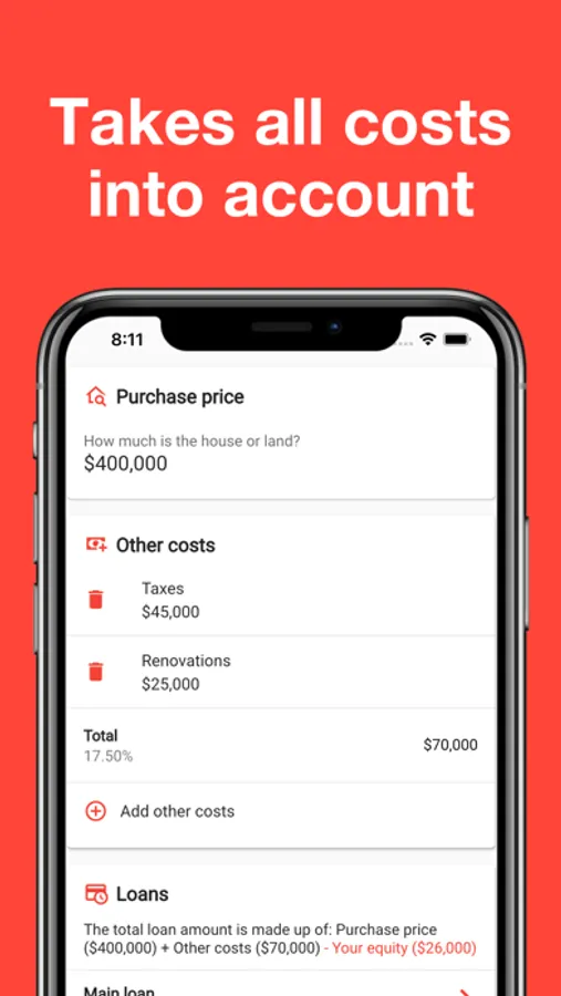 You have to manually enter the purchase price of your potential property or land of course. All additional costs, such as taxes and brokerage fees, will be entered automatically by the app, if the country you want to buy in is already supported. You can enter any other costs, such as expenses for a planned renovation or the actual construction of the house. Together with your saved equity, the app automatically calculates your required financing amount.