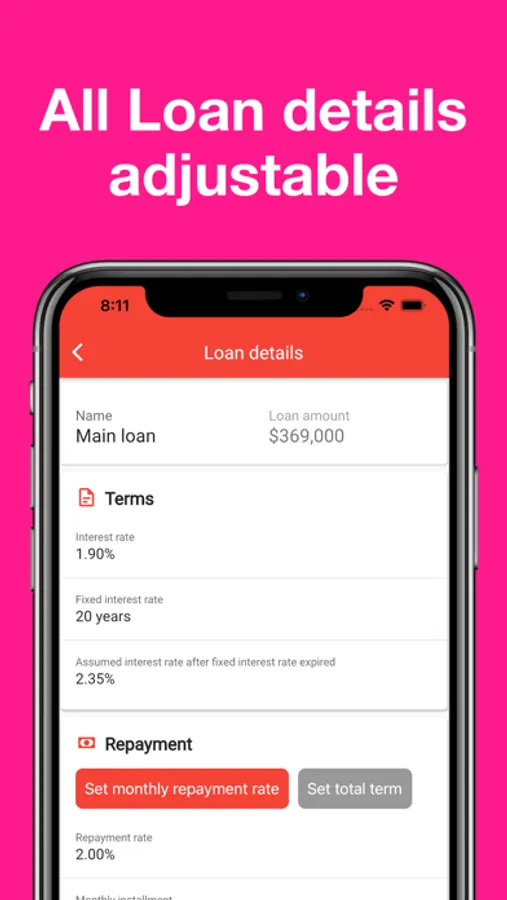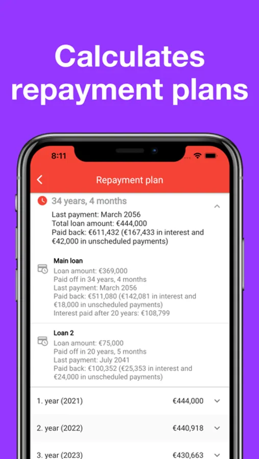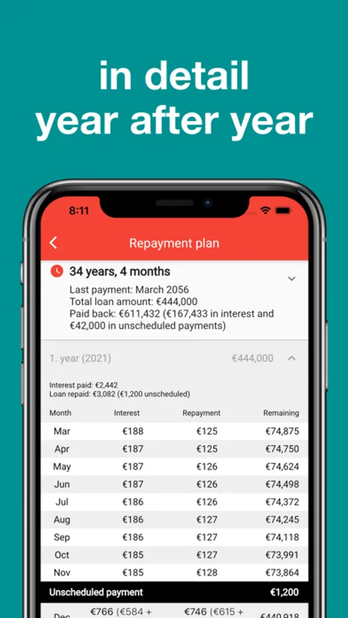 The app calculates a monthly payment plan for you, showing you exactly how much you pay in interest and repayments every month, year after year, when you have paid off which loan and exactly how much interest you paid in total. Experiment with different interest rates, fixed interest rates, monthly installments, etc. to determine your optimal payment plan.