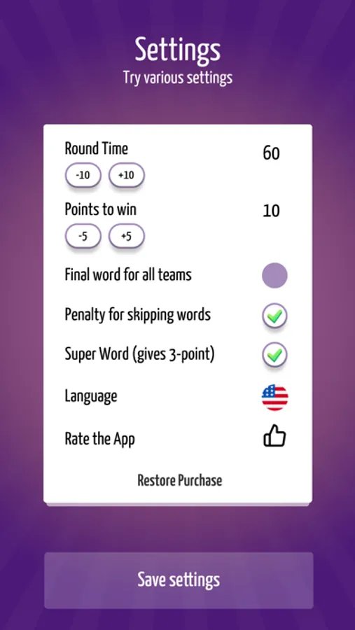 Change Round Time, Points to Win, Final Word for All, Penalty for the Missed Word!