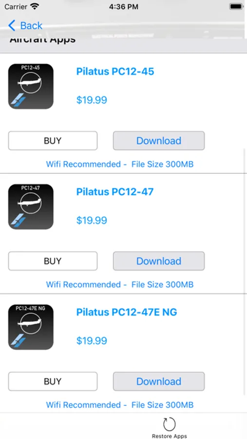 STEP 3: Tap the Buy button under the Pilatus aircraft you wish to purchase. Your account will be charged a one time price for the material and content. The price is listed on each Aircraft App and the price will be different based on the content in each app.