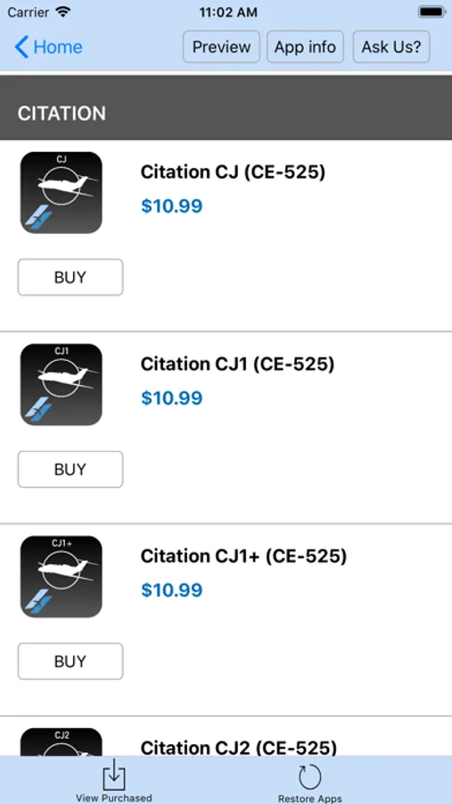 STEP 3: Tap the Buy button under the aircraft you wish to purchase. Your account will be charged a one time price for the material and content. The price is listed on each Aircraft App and the price will be different based on the content in each app.