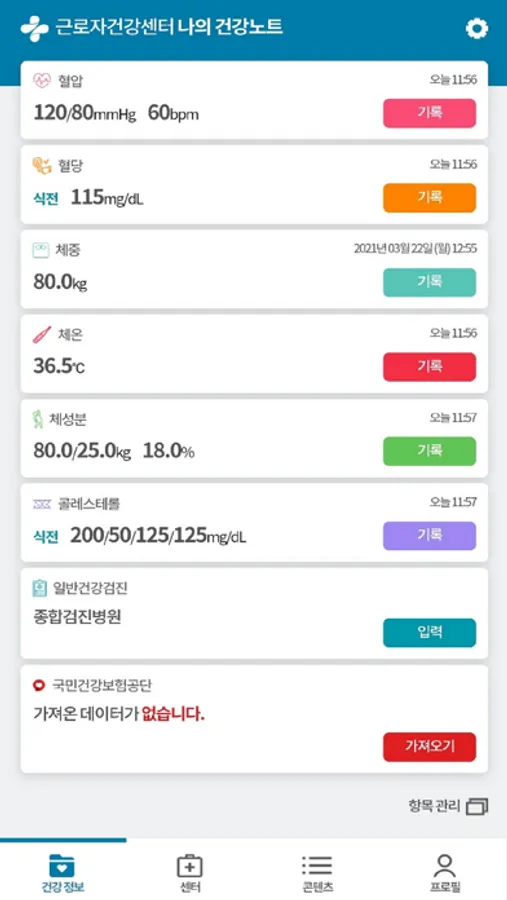 ① 건강정보 : 혈압, 혈당, 체중, 체온, 체성분, 콜레스테롤 기록