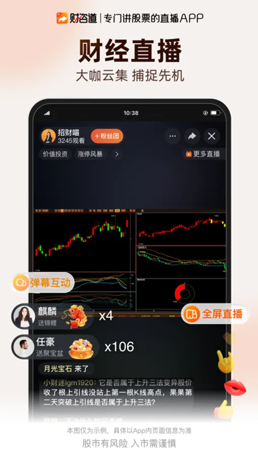 财经直播:众多财经主播以直播的方式分享方法、经验,分析实时热点,挖掘行业赛道,助您躲避雷区,捕捉机会。